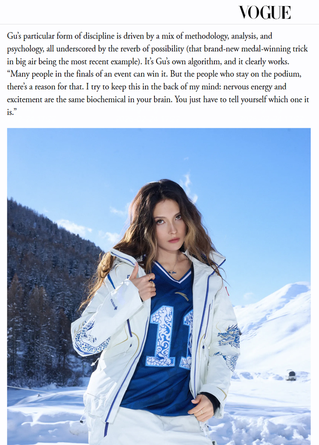 例如谷爱凌的比赛服融合了青花瓷纹样与青龙刺绣的设计,在互联网上的讨论热度颇高。不仅国内网友争相晒图求同款,就连海外社区也对这件衣服颇为认可,时尚杂志《Vogue》更在最新一期采访中刊登了她身着安踏战袍的照片。全程参与设计的谷爱凌显然也对这件装备十分满意,赛后接受外媒采访时毫不掩饰自己的喜爱与骄傲。