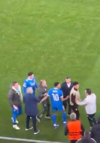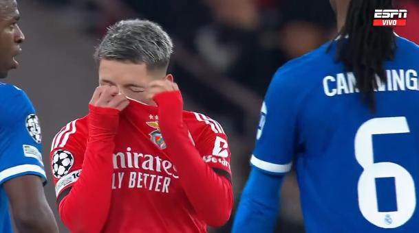 巴西前锋坐到替补席,拒绝继续上场比赛。在坐到替补席之前,维尼修斯还跟穆里尼奥解释詹卢卡·普雷斯蒂安尼对他骂了什么。皇马球员还跟本菲卡教练组成员发生冲突,本菲卡教练组一名成员被红牌罚下。比赛停顿了将近十分钟,期间,穆里尼奥和阿韦洛亚一对前师徒还发生争吵,穆里尼奥试图劝说维尼修斯回到场上重新比赛。